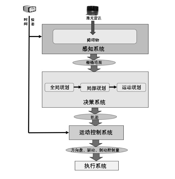 宇锋无人牵引车采用的智能系统分层式体系结构,该结构拥有明确的接口体系以及递进的性能表现,如图所示,包括系统输入、感知系统、决策系统、运动控制系统、执行系统等模块。