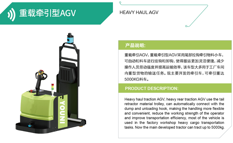重载牵引AGV,重型后牵引AGV采用尾部拉钩牵引物料小车,可自动和料车进行挂钩和卸钩,使得搬运更加灵活便捷,减少操作人员劳动强度并提高运输效率,该车型大多用于工厂车间内重型货物的输送任务。现主要开发的牵引车,可牵引重达5000KG料车。