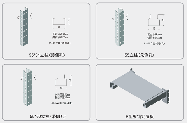 这类货架采用无横梁的结构形式。每层搁板的四个角通过四个卡扣与立柱片连接在一起,每层均布承载一般不超过100Kg。这类货架为了保证稳定性,需要配置背交叉拉杆,所以只能实现单面取货。
